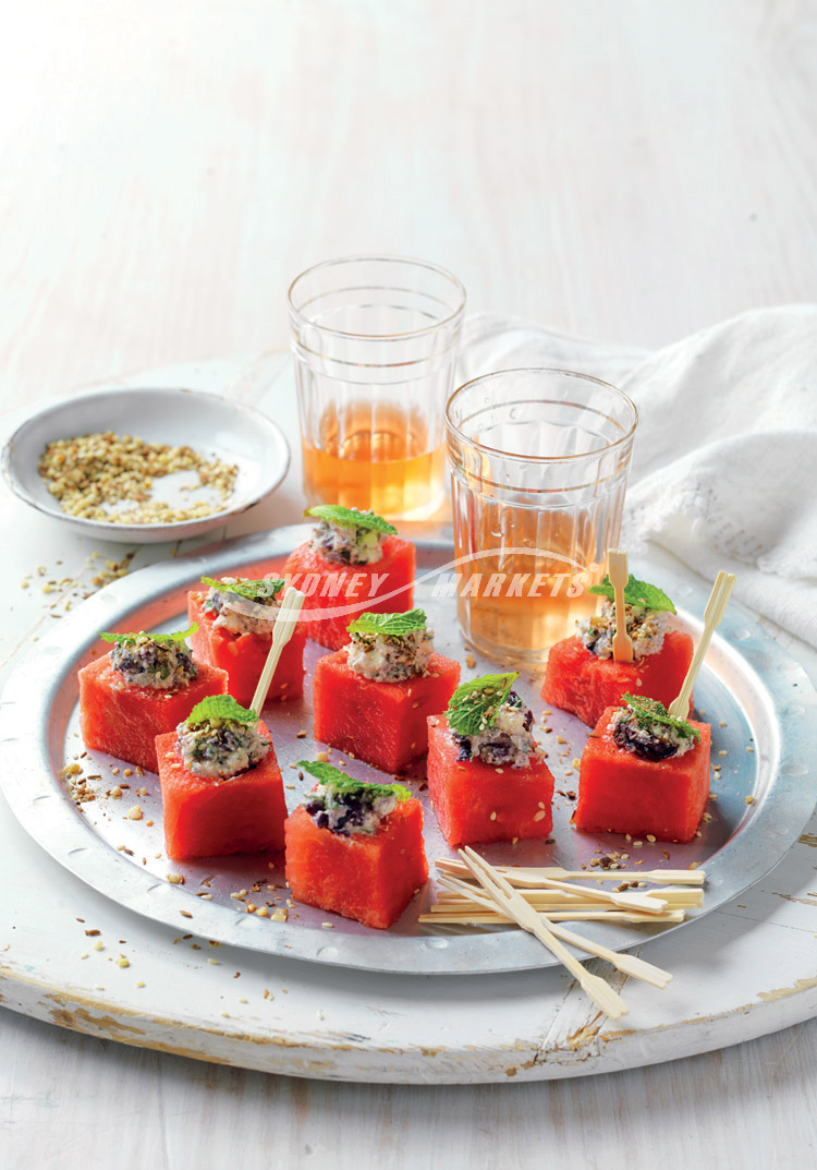 Step 2 Beat feta in a small bowl until smooth. Stir in mint and olives. Spoon mixture into watermelon cubes. Top each with a small mint leaf. Place onto a serving tray, sprinkle with dukkah and serve.